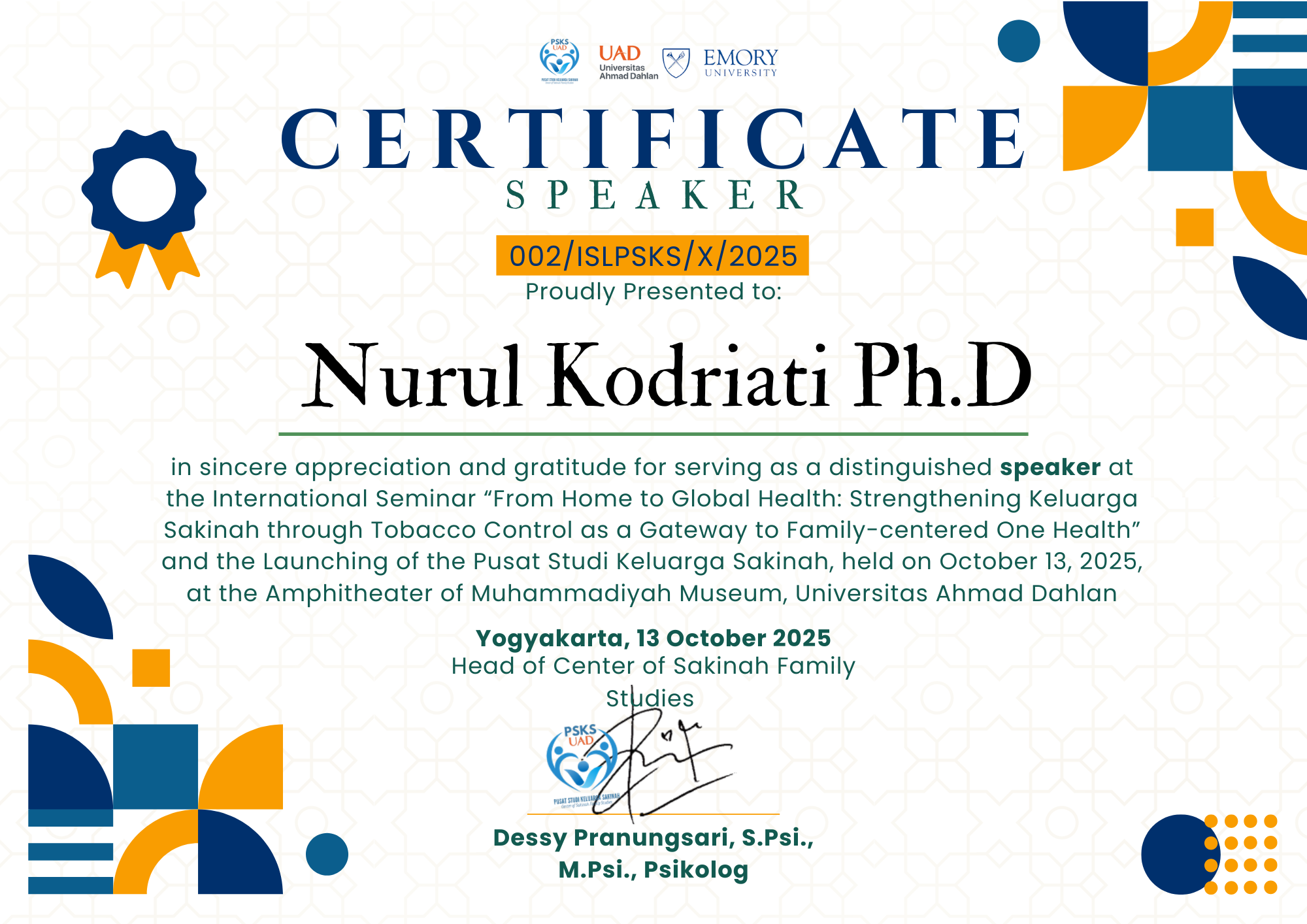 Kodriati, Nurul Sertifikat Pembicara Seminar Internasional dan Launching PSKS UAD. Pusat Studi Keluarga Sakinah UAD. (Unpublished)